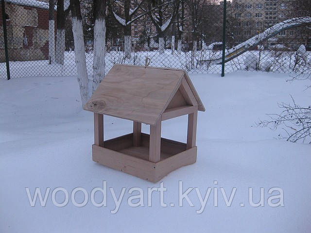 Дерев'яна підвісна годівниця прикрасить Ваш сад, а пташки зможуть поживитися. Розмір - 25 * 20 * 25 (В) см. Можливе нанесення логотипу\тексту під замовлення.